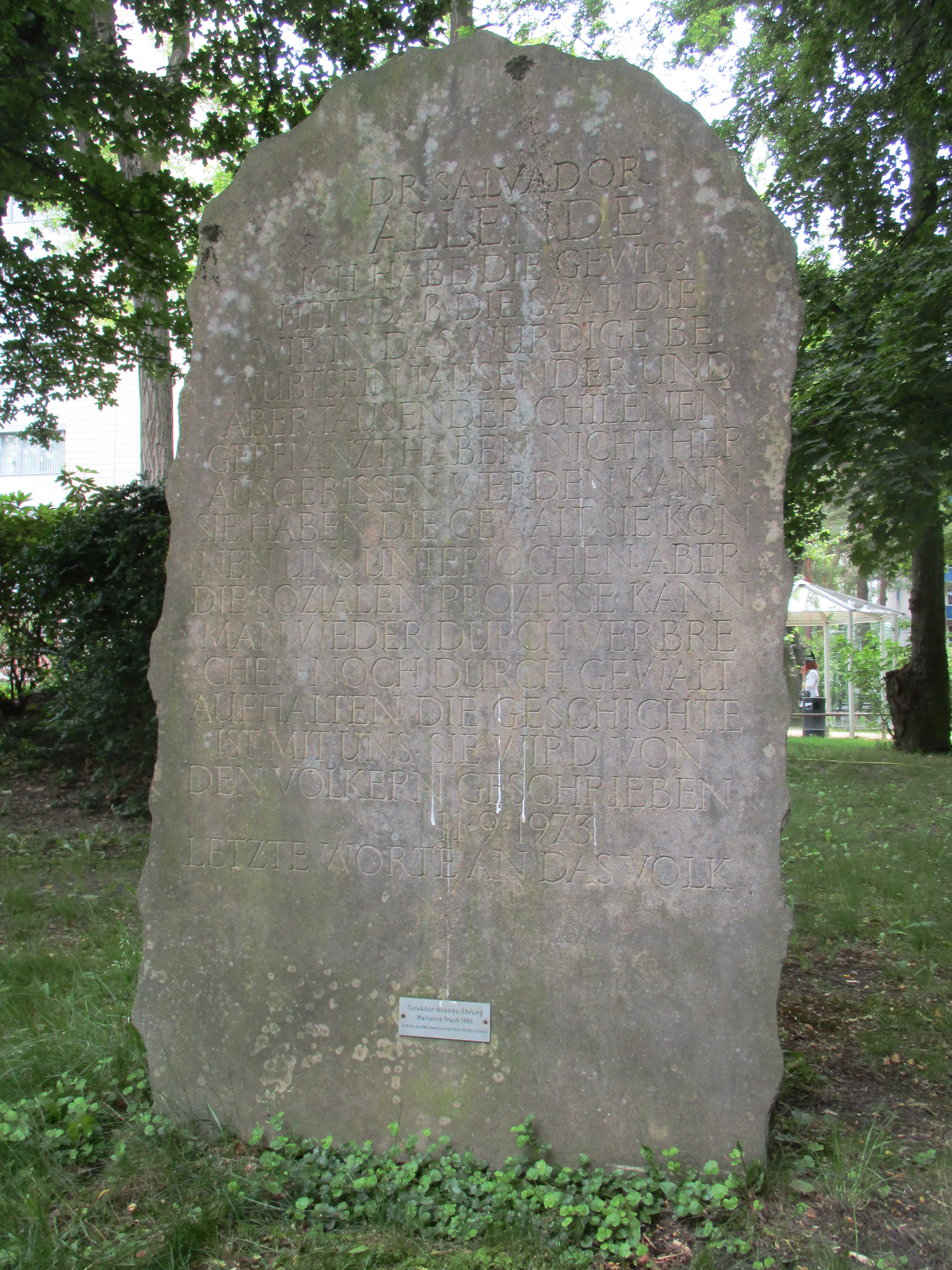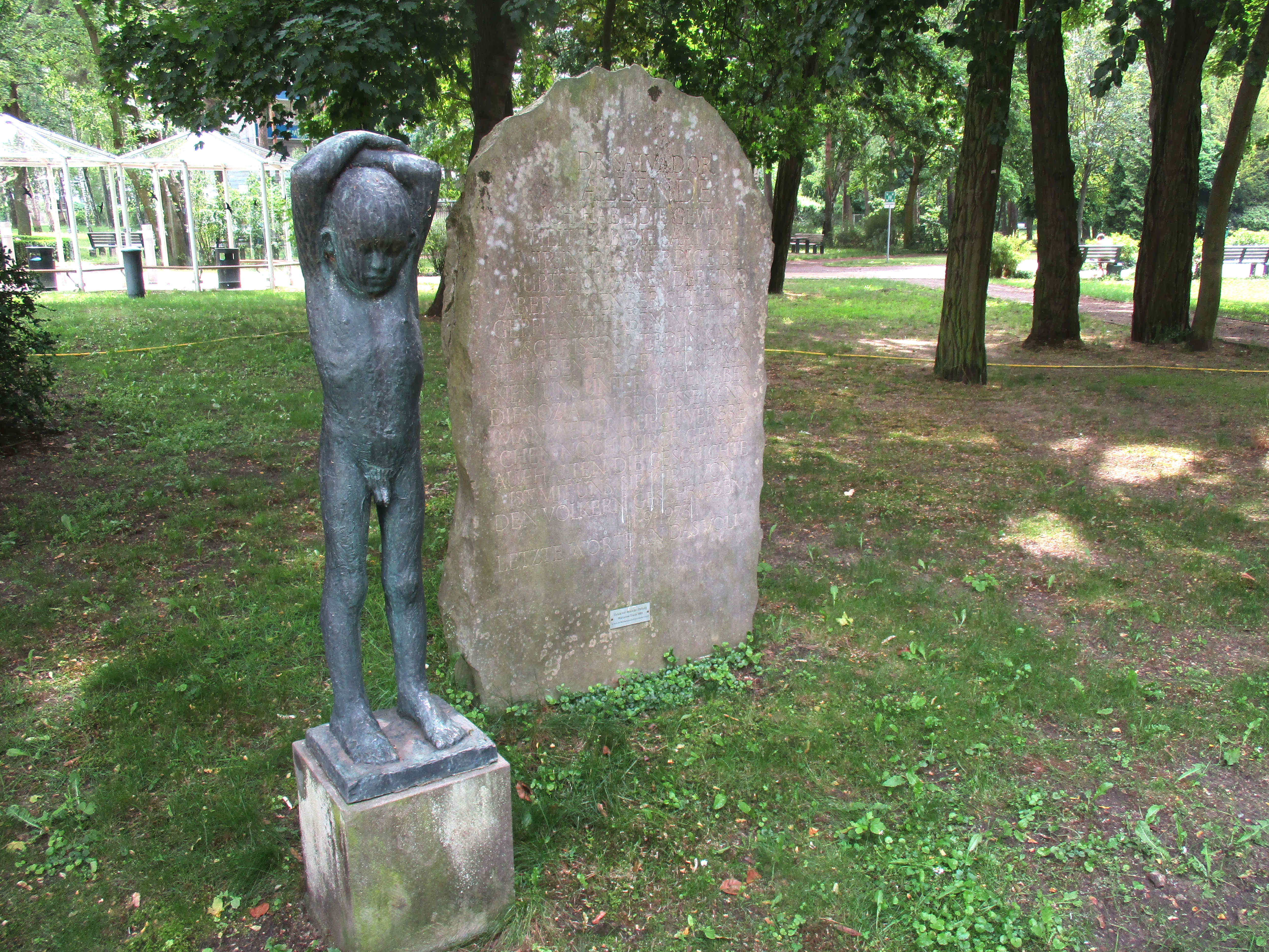 Este „Homenaje a Allende“ consta de dos partes: La escultura de bronce „Niño protegiéndose“ simboliza el sufrimiento del pueblo chileno tras el golpe militar, mientras que la estela lleva como inscripción una parte del último discurso de Salvador Allende. Su discurso fue transmitido en directo por la radio el día del golpe, poco antes de su muerte.