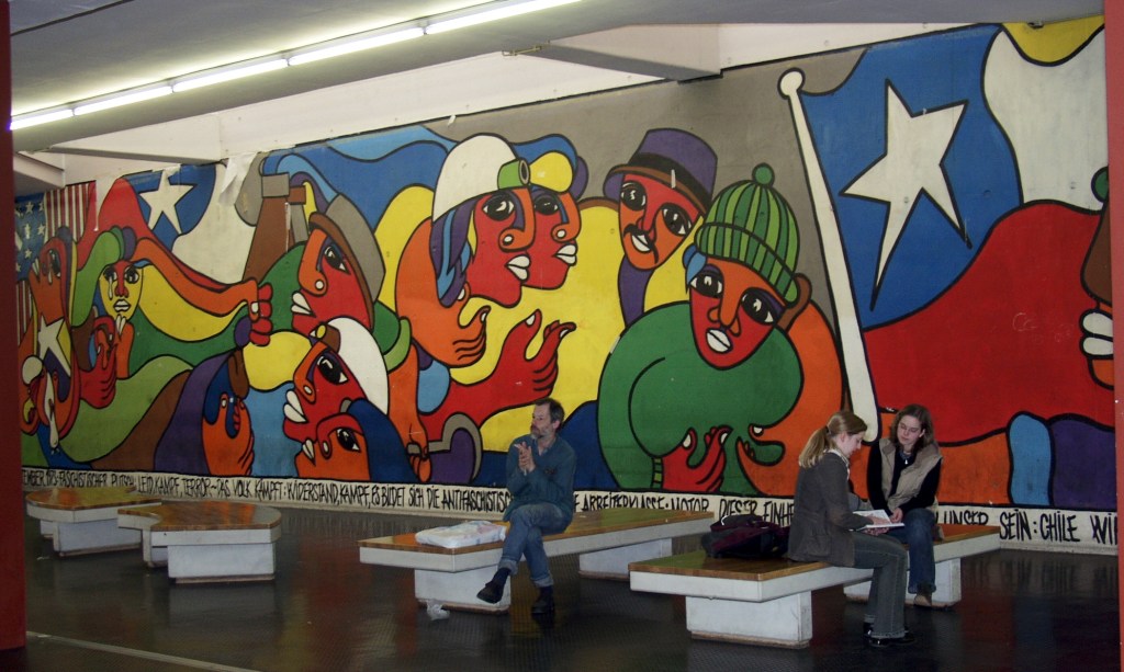 El mural de Chile en la Universidad de Bielefeld fue planeado y realizado en secreto por un grupo de estudiantes. La administración de la universidad no sabía nada al respecto, lo que en un principio provocó una gran polémica. Al final, se decidió conservar la obra de arte, que ahora está bajo protección monumental.